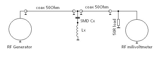 Mezi radioamatérskou komunitou sice často jsou k dispozici různé měřiče indukčností, ale jejich měřicí rozsahy začínají obvykle až u desítek mikroHenry a měřicí svorky jsou navíc tak daleko od sebe, že z důvodu parazitních indukčností u cívek pro VKV pásma nenaměříme zhola nic. Protože nejbližší pomocnou ruku jako obvykle najdeme na konci svého ramene, je vhodné se rozhlédnout po hamshacku a podívat se, jaké měřicí zařízení jsou k dispozici. Celý trik měření hodnot malých indukčností totiž spočívá v tom, že musíme převést to, co měřit neumíme, na to, co měřit umíme. To je především kmitočet. Ne, nepotřebujeme k tomu čítač. Staří VKV praktici měli na stole obvykle GDO, ale tohle zařízení je dnes už minulostí. Stačí však přeladitelný generátor a VF milivoltmetr. V nouzi pevný generátor a měřič malých kapacit. Čím přesnější tyto přístroje jsou, tím přesnější měření bude. K tomu, abychom něco naměřili, je nejprve zapotřebí si sestavit měřicí obvod. Cívku o neznámé indukčnosti zapojíme do rezonančního obvodu se známým kondenzátorem (nejlépe SMD kondenzátor malých rozměrů s nízkou tolerancí) a změříme rezonanční kmitočet obvodu v tomto zapojení: Obrázek: měřicí obvod pro zjištění indukčnosti cívky (na obrázky klikni):