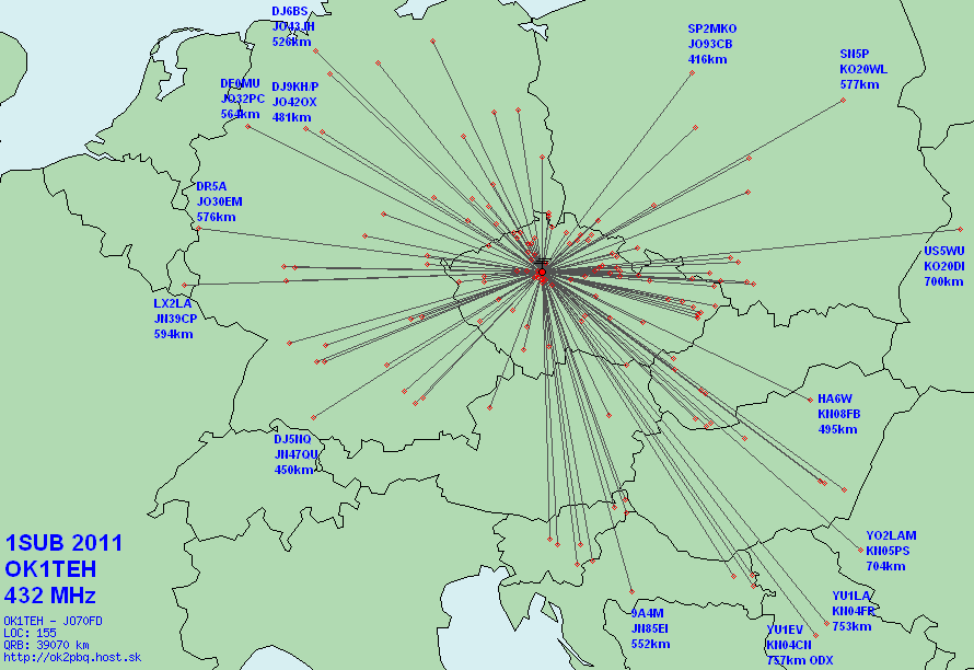 Celkový dojem ze závodu tedy celkem OK, nový předzesilovač se osvědčil a již v následujících dnech se díky jemu daří pěkné 70cm EME QSO s NR5M, G4FUF, S51ZO a VA3GMT. 73 a naslyšenou na VKV se těší Matěj, OK1TEH PS na závěr nějaká ta statistika: 1. subregionální závod 2011 - OK1TEH - výsledky: |