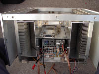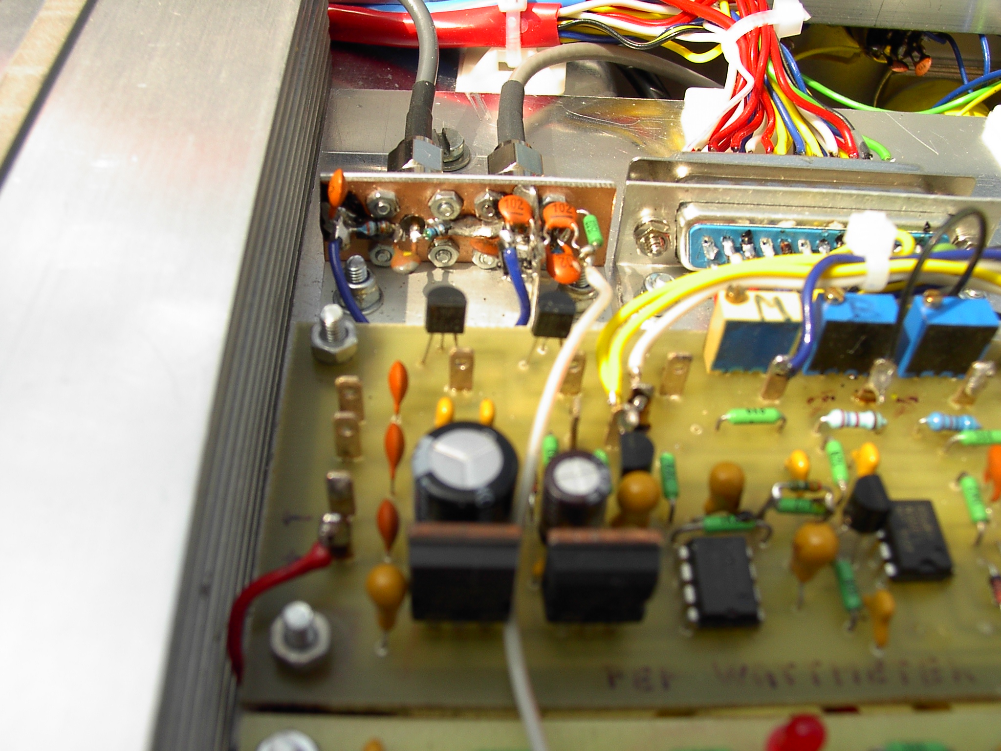 July report from Czech Field day VHF Contest 2010 remind our new solid state PA for 70cm. Although this PA design is quite ordinary, readers of OK2KKW web maybe will consider some photos and a brief commentary about it's construction as an inspiration. The PA use two surplus 400W solid state blocks, bought in Poland, probably available from upgrade of some US cell phone Base Stations. The US cell phone network operates around 450 MHz and one of these module was used in very reliable telecommunication mode for max 100W out. However the module based on four double SD56120M transistors and driver stage by two XRF9045 may deliver (based on the datasheet) about 480W RF max with no problem to operate as well as on 432MHz. Because the amateur radio operation request specific attenuation of intermodulation products, the PA blocks are operated up to 400W output limit only, when the IP3 products are about 26dB below PEP. Each PA block consist of two separated PA modules with about 200W out, the input and output are combined with 90° hybrid units consisting of original microstrips on Teflon PCB with thickness of 0,8mm. Please note that these power modules aren't identical, the left and right module differ in layout of components and position of mounting holes. The 200W PA modules (the heart of 400W PA) are bolted to the aluminum pad with thickness of approximately 8mm, which distributed the heat from the power transistors on whole surface of heatsink and can be easily removed from the cooling block. That's what I did: I dismantled both 400W PA blocks to elementary components (after PA dismantling there left a circulator which I found useless for new PA - it's just in 100W version with built in load resistor, followed by small microstrip directional coupler) and cut off part of heatsink, because the original size was too big and heavy for amateur operation, supported by ventilators. The heatsink was cut off by the water jet beam (hot laser would destroy the ribs due to abt. 15mm thick of heatsink body). The remain part of cooler with a width of 11cm will be used for some other future construction. And at last but not least reason for size reducing was the fact that all my power amplifiers since 1985 were designed for width of 19 inches, so they can be plugged into a standard telecommunication rack and I didn't want to make this PA dimensionally incompatible. :-) The heatsink blocks were used as a part of the main PA structure and I bolted them together into a sort of frame with square 30x30mm aluminum hollow profiles, which are at their ends plugged by 25x25x50mm solid aluminum profile. These hollow sections excess both PA modules and are used for bolting of aluminum side-plates with thickness of 8mm (6mm would be enough however I already had older 8mm aluminum plate so I used it). In the middle of side-plates are recessed tipping military holders which I got in local surplus store. At the bottom of the PA (in the middle of space between coolers) on 2mm thick aluminum plate is fixed switching power supply Meanwell 27V/56A. With these power supplies (by the way also used by Michael, DB6NT) I have good experiences, they are reliable and they do not produce any harmful interference. The power supply can be adjusted by trimmer to 29,5V DC, it has overvoltage, overcorrect and thermal protection and in peek it can easily deliver over 62Amps, which is for our 800W PA just about the limit of maximal allowed current of both PA blocks. Next to switching power supply are placed on both sides (in an otherwise difficult available space under the cooling ribs) the RLC supply filters, which are designed to remove the remaining power supply's voltage switching peeks. The cooling of both PA blocks is solved by tunnels from 2m thick AL plate, which are bent into a U-shaped and lined with another plate of trapezoidal shape, which forces the air flow through the cooling ribs. On the front panel are situated two ordinary 80x80 axial 24V fans (operating at 29V) which blow air to cooling tunnels and at the rear panel are similar two fans which drain hot air out. Fans run during TX period and if cooler temperature exceed 40°C, fan continue running even during RX mode. PA was tested with full power out in FSK441/JT65 in warm room during 24h Field day contest 2010, Perseids 2010 and long time EME operation and PA cooling was found more then sufficient. Above the switching power supply was found additional place for input direction coupler, 90° divider of driving power (Wilkinson type with lambda/4 phase line), 90° hybrid output coupler for combination of both PA modules output PWR and a direction coupler for PWR measuring and SWR protection. On the top floor are situated electronic circuits for controlling and monitoring the entire PA. After assembling of PA mechanic I mounted PA blocks back to coolers blocks (don't forget to remember to suitable thermal conductive grease). For the complete description of the PA mechanics left just the front panel, which carries two analogue meters (for summary supply current and output RF PEP), followed by two double bar graph indicating the current and RF power of each side PA power module. On the rear panel between the fans and connectors I found a place for Tohtsu CZX-3500 coaxial relay. So that's all about the description of mechanical design. Maybe I should mention, that both PA blocks are able to deliver on 70cm 400W of RF power at about 1dB compression and therefore it's not advised for SSB operation to run with bigger power output. The gain of each PA block is around 38 - 39dB and it depends piece by piece (for 400W out and 29V). The bias current of one PA block is around 3A and efficiency with 400W RF about 45 % (with current of about 31A). Each PA block is able to deliver on 70cm even higher power, which - thank to mistake - we tested :) During a brutal overdrive (with compression near 6dB) the one PA module delivered output of nearly 600W at 44A power supply (!) and survived.