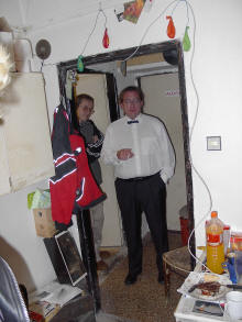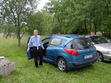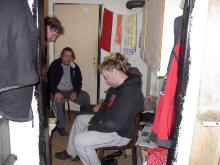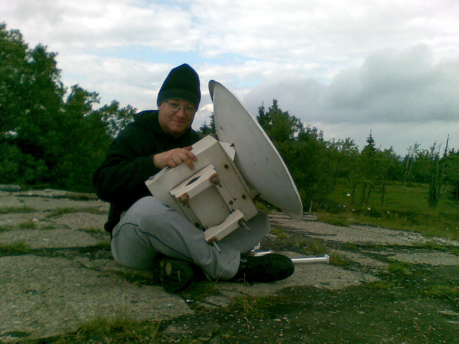 Jiiný problém ale nastal již týden před závodem, protože od 27.června začala měsíční plánovaná rekonstrukce výtahu, takže bylo nutné všechny ty bezmála 3 metráky železa odnosit.. Na kopec jsme po 300km výletě dorazili ve 2h ráno ze čtvrtka na pátek. Páteční ráno nás přivítalo teplotou kolem 7°C a zataženou oblohou, my jsme ovšem jako správní "Pražáci na výletě do přírody" vytáhli strunovou sekačku a posekali nejprve asi 50cm vysokou trávu kolem baráku, abychom se při nošení věcí a stavění antén nemuseli brodit mokrou trávou po kolena. Antény na 70cm stály záhy a tak jsme rozvinuli i 400m kabel pro mikrovlnné pracoviště na bunkru.V poledne dorazila na kopec druhá část týmu včetně osmnáctiletého Tomáše na Jawě 250 s trofejní helmou Veřejné Bezpečnosti, Jirka OK1HWU a Klimošáci s pípou a sudem Gambrinusu 11°, což nám sice hned zvedlo náladu, ale bohužel tím nutně utrpělo stavěcí tempo :-) Hned, jak jsme kolem 7h večerní měli postavené antény na 23 a 3cm, přihnal se první vydatný déšť, ale to nám již nevadilo, protože zařízení na mikrovlny se bude stavět až v sobotu. Zatím co se venku čerti ženili, ve vytopeném baráčku nám bylo dobře. Grilované maso a další pochoutky které nám připravovala Majka OK1DYX byly vynikající (newspeak ve formě "catering" bych opravdu nepoužil ;) a zábava nerušeně pokračovala až do brzkých ranních hodin. OK1DYX a OK1RK mezi tím odjeli s lístky VIP na Karlovarský filmový festival a vrátili se ve 3h ráno limuzínou Audi, řidič, který byl pozván do baráčku jenom nevěřícně kroutil hlavou - asi nikdy neviděl radioamatérský team :-)