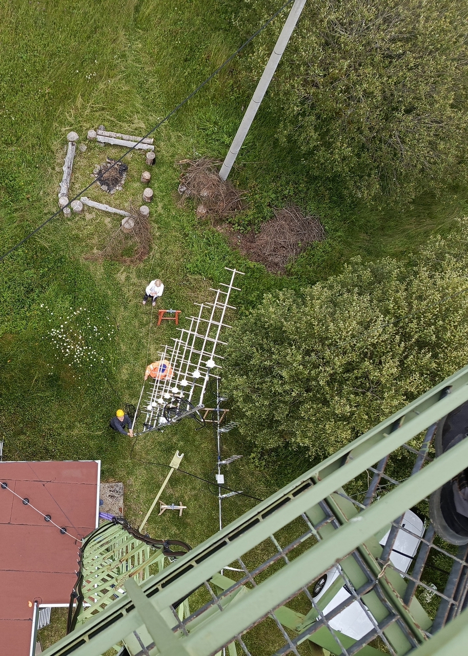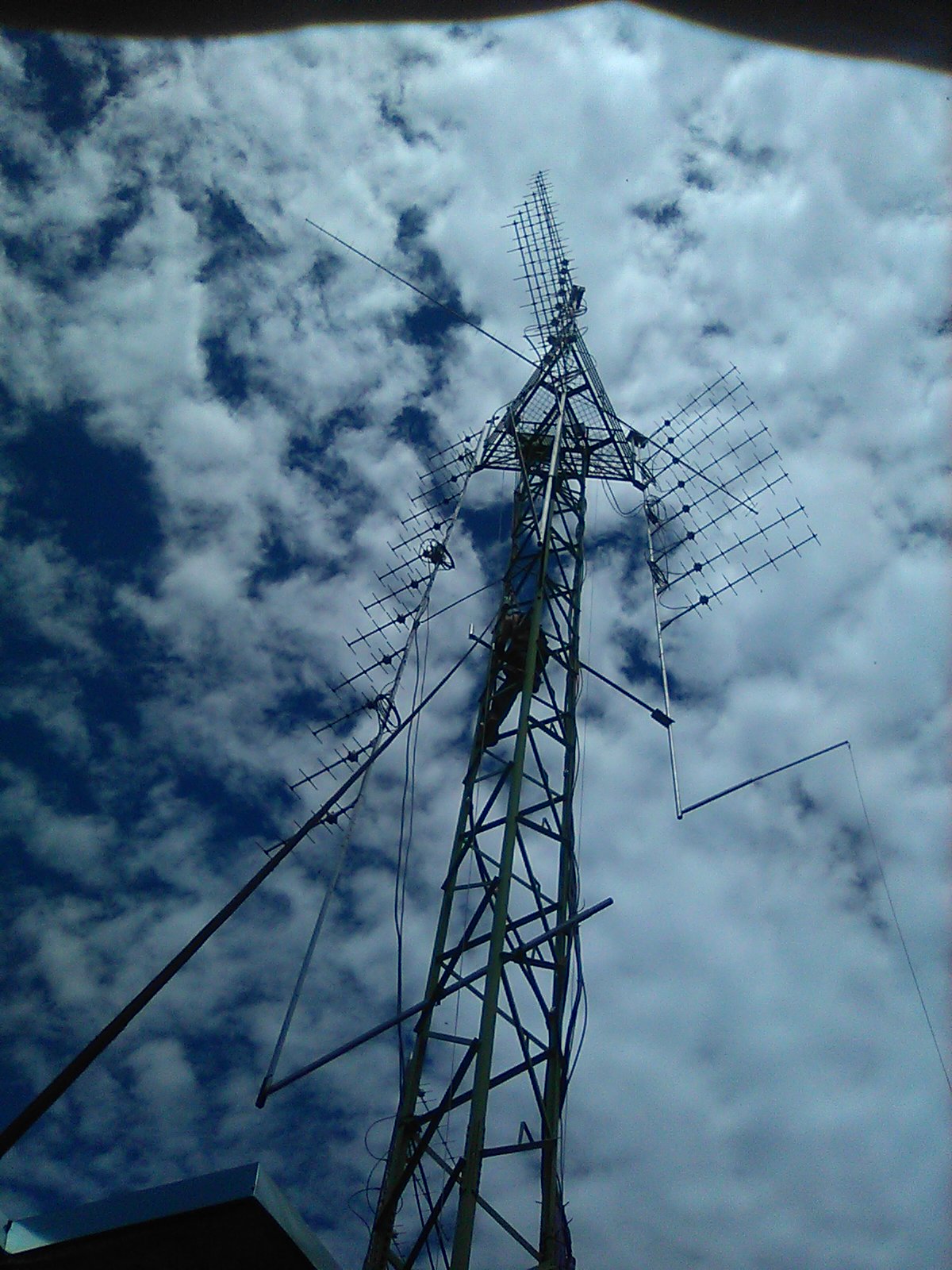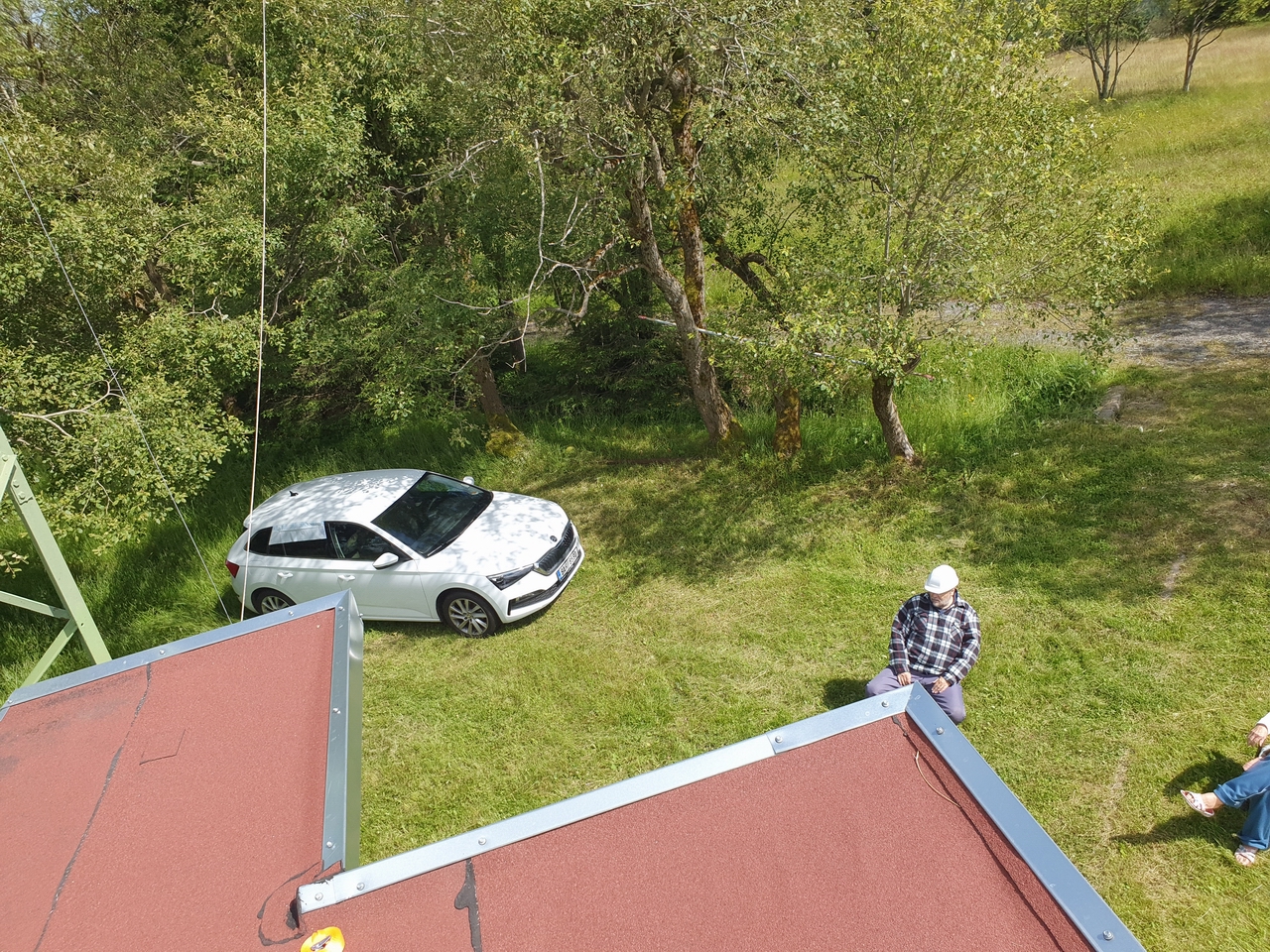 za pomoc. Tak lezeme nahoru a začíná foukat vítr. Dokud jsme seděli dole, nepohnul se na stromech ani lísteček. Celá stavba má svůj přesný postup, co a jak udělat. Během práce jsme diskutovali o tom, co tu je a proč. Velmi zajímavá a obohacující diskuze. Během práce jsem měl chvílemi volnou ruku a tak jsem udělal hromadu akčních fotek ze stavění. Jak vítr přidával na síle, stožár se houpal a ještě víc houpal… Přiznávám, že jsem prskal, že se mi to nelíbí. Po 4 hodinách jsem opět na pevné zemi a všech 5 anténních směrů je nahoře. Když jsem se občerstvoval pivem, byl jsem instruován, že by tam měl přijít ještě 6 směr. To jsem se ale orosil a zkonstatoval, že dnes v tom větru tam ani náhodou už nepolezu a zítra to snad nějak vyřešíme.