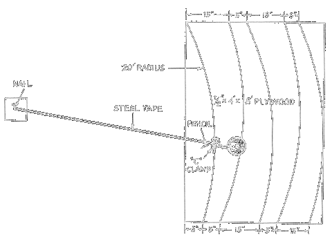 You bears for punishment may proceed with the layout and use the error figures in Table I as offsets from the circular arcs to get a true parabolic section. Good luck to you! More conservative souls will he content either to leave well enough alone at a true (as you can construct) circle or a flattened approximation, setting each tip of the main arms 1/2 inch back of the circular position. This is in effect using each half of the reflector as a separate unit aimed at a common point, and it works out to an error of about 0.3 inch. See Column 5 in Table I. The Moon-Tracking Mount