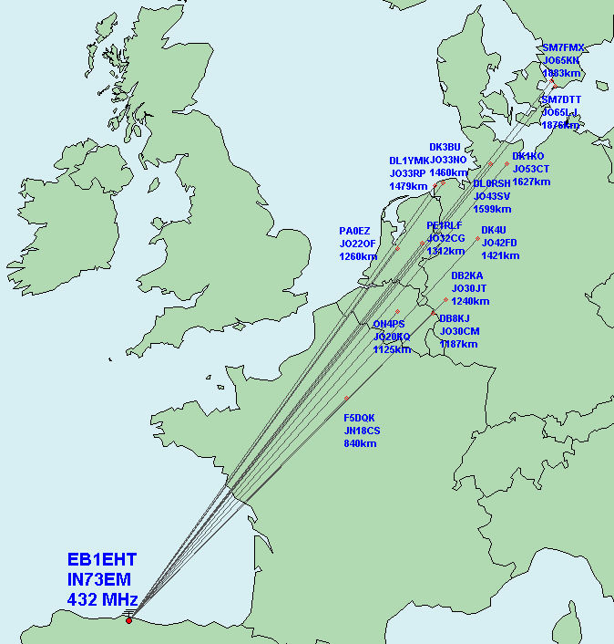 ---------------------------------------------------------------------------- DJ6JJ 432200.0 EA1DDU io73em fine 0911 27 Dec 2006 SM7DTT-@ 432200.0 EA1DDU TNX QSO 1st SM-EA on 70? 88 to0936 27 Dec 2006 OZ1DLD 432200.0 EA1DDU pse call dir JO45. Hear you 510950 27 Dec 2006 DB8KJ 432200.0 EA1DDU IN73 now RST55 in JO30 0951 27 Dec 2006 PE1ITR 432199.0 EA1DDU IN73EM(TR>JO21QK 53 1010 27 Dec 2006 DK1KO 432200.0 EA1DDU i call cw to EA 1012 27 Dec 2006 ON4PS-@ 432200.0 EA1DDU = EB1EHT IN73EM 55 in JO20KQ 1043 27 Dec 2006 PE1HWO 432200.0 EA1DDU IN73EM(TR>JO21GV 55 1044 27 Dec 2006 OZ6OL-@ 432200.0 EA1DDU jo65>in73 tropo random 57 ssb!1105 27 Dec 2006 SM7ECM 432200.0 EA1DDU IN73-JO65 1900km ! 1108 27 Dec 2006 DG1KJG 432000.0 EA1DDU qrv 23cm ? 1111 27 Dec 2006 EA1DDU 432200.0 SM7ECM Nice tropo cdx!! I'm moving to1111 27 Dec 2006 EA1DDU 432220.0 DG1KJG CQ BEAMING OZ, SM, LA! 1114 27 Dec 2006 SM7ECM 432000.0 EA1DDU QRV 23cm? I call on 1296.200 1115 27 Dec 2006 DK3BU 432198.0 EA1DDU IN73 59->JO33 1134 27 Dec 2006 DL3YEL 432199.0 EA1DDU in73em>jo41ev cq 1229 27 Dec 2006 PA2M 432199.0 EA1DDU still 55 in jo21 1244 27 Dec 2006 DK3BU 432200.0 EA1DDU still 58 1256 27 Dec 2006 EA1DDU 432200.0 DL7APV IN73(>JO62 Great! 1258 27 Dec 2006 DL8BDU 432200.0 EA1DDU 51 > 53 JO43>IN73 1313 27 Dec 2006 PA3HHE 432199.0 EA1DDU & ea1eht 57 in jo22 1313 27 Dec 2006 DK4U 432199.0 EA1DDU ea1ebj eb1eht all 52->jo42 TU 1337 27 Dec 2006 SM7DTT-@ 432201.0 EA1DDU Here again in JO65LJ - 5 5 QSB1343 27 Dec 2006 DG5AAG 432201.0 EA1DDU JO51CT(TR>IN73EM hrd 1345 27 Dec 2006 DG1FKA 432201.0 EA1DDU 53 jo31 Happy 2007!!! 1356 27 Dec 2006 DG5AAG 432199.0 EA1DDU hrd u pse ant. to JO51CT 1405 27 Dec 2006 DK4U 432200.0 EA1DDU back again ! 53->jo42 1511 27 Dec 2006 DK4U 432201.0 EA1DDU in73 53 ->jo42 few takers 1529 27 Dec 2006 DK4U 432200.0 OZ1IEP clg ea1ddu 1540 27 Dec 2006 DG7TG-@ 432200.0 EA1DDU in73 hrd 57-59 all time..... 1554 27 Dec 2006 DK1KO 432201.0 EA1DDU 57 1601 27 Dec 2006 DK3BU 432199.0 EA1DDU still 56! 1623 27 Dec 2006 SM7FMX 432200.0 EB1EHT +EA1DDU JN73(>JO65KN TNX GL 1631 27 Dec 2006 DK4U 432201.0 PD0HCV clg ea1ddu 1636 27 Dec 2006 DK4U 432201.0 EA1DDU wants 2 try 23cm later 1639 27 Dec 2006 ---------------------------------------------------------------------------- DB2KA 432200.0 EB1EHT in73em>jo30jt 57-59 0917 27 Dec 2006 PA0EZ 432200.0 EB1EHT wkg sm7dtt !!!!! 0932 27 Dec 2006 DB8KJ 432200.0 EB1EHT IN73EM RST52 in JO30 0938 27 Dec 2006 F5DQK 432200.0 EB1EHT 55 in Paris 0939 27 Dec 2006 SM7DTT-@ 432200.0 EB1EHT JO65LJ - IN73EM 1872km 0945 27 Dec 2006 DK1KO 432200.0 EB1EHT 52 1029 27 Dec 2006 DL1YMK 432199.5 EB1EHT JO33(>IN73 1476km, not bad... 1034 27 Dec 2006 ON4PS-@ 432200.0 EA1DDU = EB1EHT IN73EM 55 in JO20KQ 1043 27 Dec 2006 PE1RLF 432200.0 EB1EHT nice signal up to 5/5 1051 27 Dec 2006 DK3BU 432198.0 EB1EHT IN73 59->JO33 1134 27 Dec 2006 DK4U 432199.0 EA1DDU ea1ebj eb1eht all 52->jo42 TU 1337 27 Dec 2006 DK4U 432201.0 EB1EHT yl Ara 52 in73em -> jo42 1532 27 Dec 2006 DL0RSH-@ 432200.0 EB1EHT in 73 - JO43SV tnx 73 !! 1535 27 Dec 2006 SM7FMX 432200.0 EB1EHT +EA1DDU JN73(>JO65KN TNX GL 1631 27 Dec 2006 ---------------------------------------------------------------------------- DB2KA 432200.0 EB1EHT in73em>jo30jt 57-59 0917 27 Dec 2006 PA0EZ 432200.0 EB1EHT wkg sm7dtt !!!!! 0932 27 Dec 2006 DB8KJ 432200.0 EB1EHT IN73EM RST52 in JO30 0938 27 Dec 2006 F5DQK 432200.0 EB1EHT 55 in Paris 0939 27 Dec 2006 SM7DTT-@ 432200.0 EB1EHT JO65LJ - IN73EM 1872km 0945 27 Dec 2006 DK1KO 432200.0 EB1EHT 52 1029 27 Dec 2006 DL1YMK 432199.5 EB1EHT JO33(>IN73 1476km, not bad... 1034 27 Dec 2006 ON4PS-@ 432200.0 EA1DDU = EB1EHT IN73EM 55 in JO20KQ 1043 27 Dec 2006 PE1RLF 432200.0 EB1EHT nice signal up to 5/5 1051 27 Dec 2006 DK3BU 432198.0 EB1EHT IN73 59->JO33 1134 27 Dec 2006 DK4U 432199.0 EA1DDU ea1ebj eb1eht all 52->jo42 TU 1337 27 Dec 2006 DK4U 432201.0 EB1EHT yl Ara 52 in73em -> jo42 1532 27 Dec 2006 DL0RSH-@ 432200.0 EB1EHT in 73 - JO43SV tnx 73 !! 1535 27 Dec 2006 SM7FMX 432200.0 EB1EHT +EA1DDU JN73(>JO65KN TNX GL 1631 27 Dec 2006 ---------------------------------------------------------------------------- DK2EA 144277.0 EA1EBJ in73fl-jo50uf 55tr 1495km!! 1809 26 Dec 2006 DB8KJ 144330.0 EA1EBJ in73 rst59+ in jo30 1811 26 Dec 2006 DH3NAN 144225.0 EA1EBJ in73(TR>jo50 55/55 i cq 1826 26 Dec 2006 OK1TEH 144000.0 EA1EBJ hrd by OK1FD pse sked 1847 26 Dec 2006 ---------------------------------------------------------------------------- DL3YEE 432200.0 EA1EBJ 55 in73-jo42 1424km!! 1828 26 Dec 2006 F5DQK 432200.0 EA1EBJ rxed from IN 73fl - no answer 1830 26 Dec 2006 DJ9DL 432235.0 EA1EBJ 57 in jo31nc-fm-in73 HNY San 1841 26 Dec 2006 DL6NCI 432235.0 EA1EBJ in73fl-jo50vi 55 1846 26 Dec 2006 DJ9UX 432225.0 EA1EBJ JO31MD(TR>IN73FL gracias y 73 1931 26 Dec 2006 SP3NEN-@ 432225.0 EA1EBJ Jose pse ant JO73 1931 26 Dec 2006 DJ5BV 432225.0 EA1EBJ IN73(TR++>JO30KI S=9+ 1211km 1932 26 Dec 2006 DG2BCP-@ 432225.1 EA1EBJ in73-jo43 1447km tnx new# 1933 26 Dec 2006 DL6YEH 432225.0 EA1EBJ 53 JO32>IN73 tnx new # 1941 26 Dec 2006 ON8AB 432225.0 EA1EBJ in73! 1943 26 Dec 2006 DL7APV-@ 432225.0 EA1EBJ IN73 JO62 1700km!! tnx new # s2013 26 Dec 2006 DK3BU 432230.0 EA1EBJ IN73 57 1220 27 Dec 2006 PA3HHE 432219.4 EA1EBJ in73fl 55 !! 1238 27 Dec 2006 DK3BU 432226.0 EA1EBJ IN73 56 ->JO33 1244 27 Dec 2006 DG5AAG 432219.4 EA1EBJ JO51CT(TR>IN73FL hrd 51 1495km1247 27 Dec 2006 DG5AAG 432225.3 EA1EBJ JO51CT(TR>IN73FL now here 1250 27 Dec 2006 DK4U 432199.0 EA1DDU ea1ebj eb1eht all 52->jo42 TU 1337 27 Dec 2006 DK4U 432201.0 EA1EBJ now here, 52 in73->jo42 1342 27 Dec 2006 PD0HCV 432200.0 EA1EBJ 5-5 jo31fw(TR>in73fi 1752 27 Dec 2006 OZ8ZS 432200.0 EA1EBJ 55 jo55>in73fl tnx # 1753 27 Dec 2006 PD0EBF 432200.0 EA1EBJ in73fl 1203km ! 1758 27 Dec 2006 OR0A 432225.6 EA1EBJ IN73/JO20 53/41 wkd with 20 w.1811 27 Dec 2006 OZ8ZS 432226.0 EA1EBJ CQ dir OZ jo55>in73fl 1816 27 Dec 2006 SM7FMX 432225.0 EA1EBJ TNX GL HNY 73 1832 27 Dec 2006 OZ8ZS 433226.0 EA1EBJ Hrd 55 now jo55>in73 1855 27 Dec 2006 DG