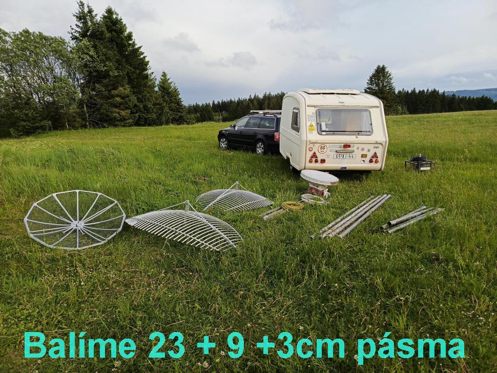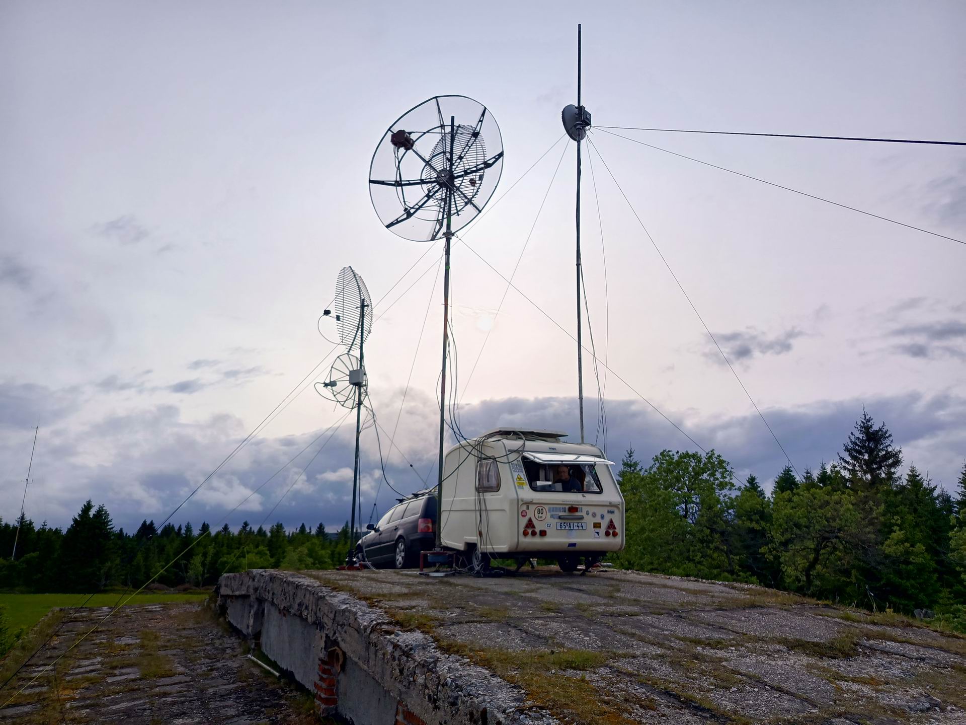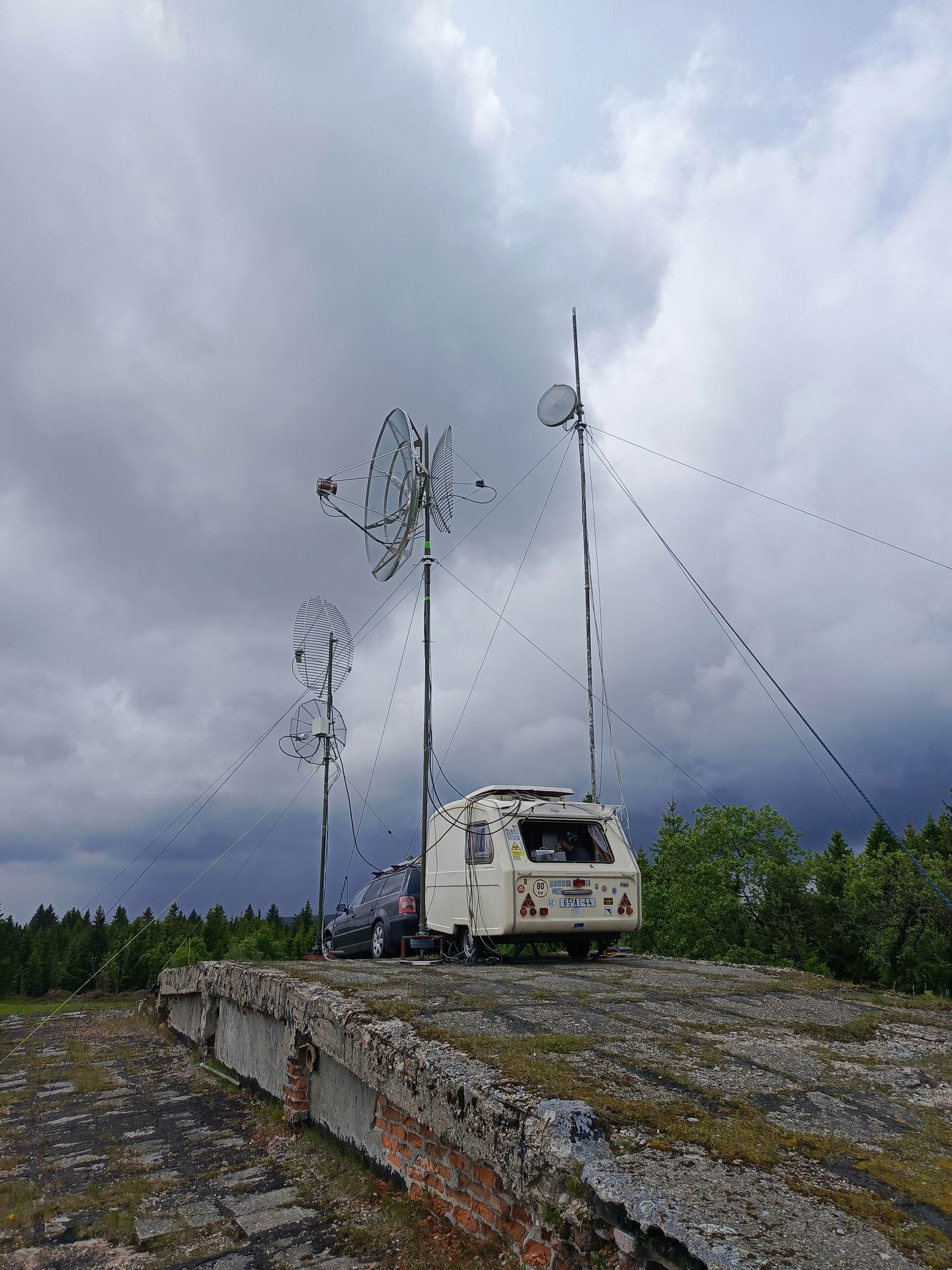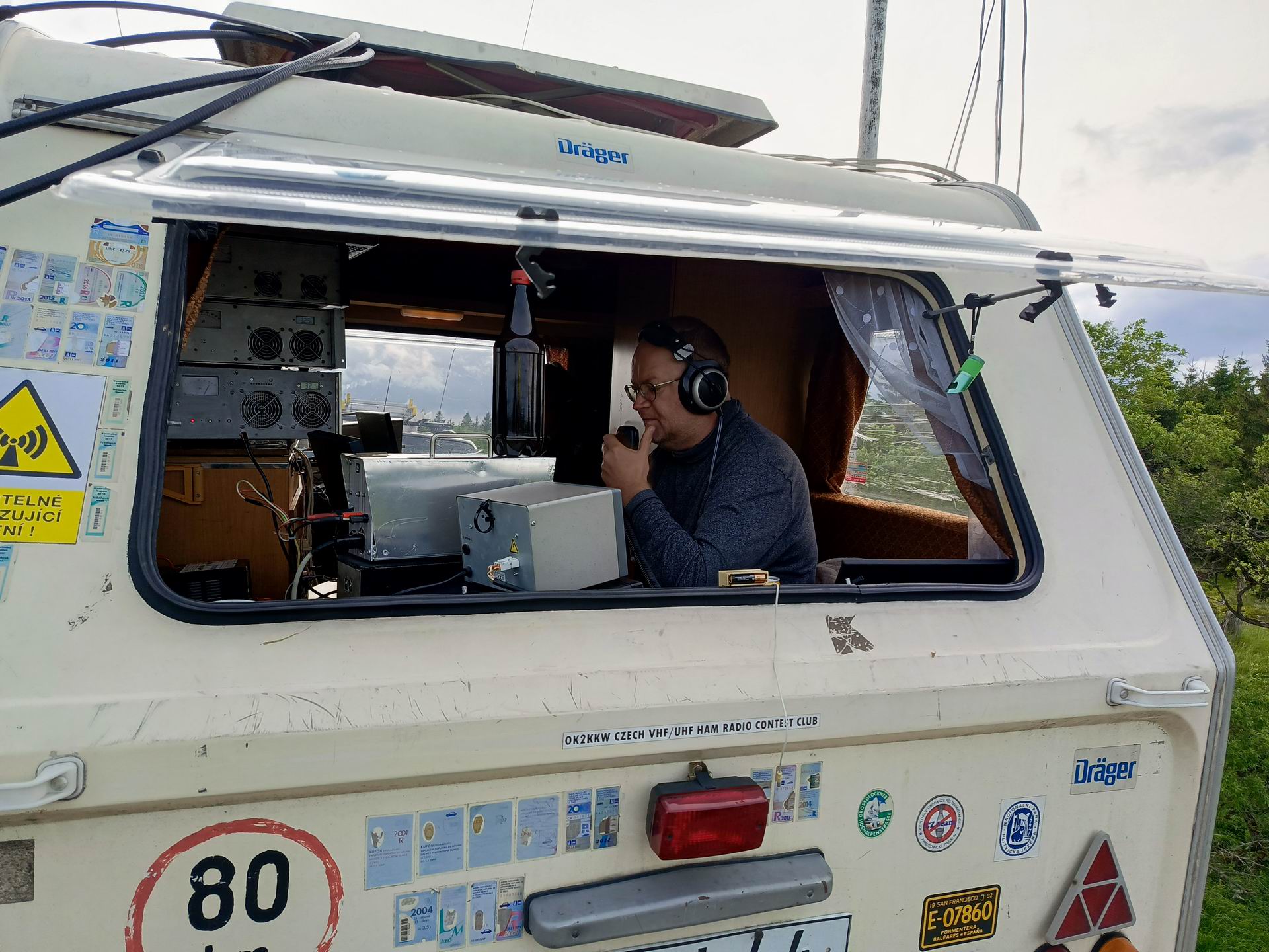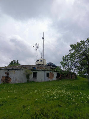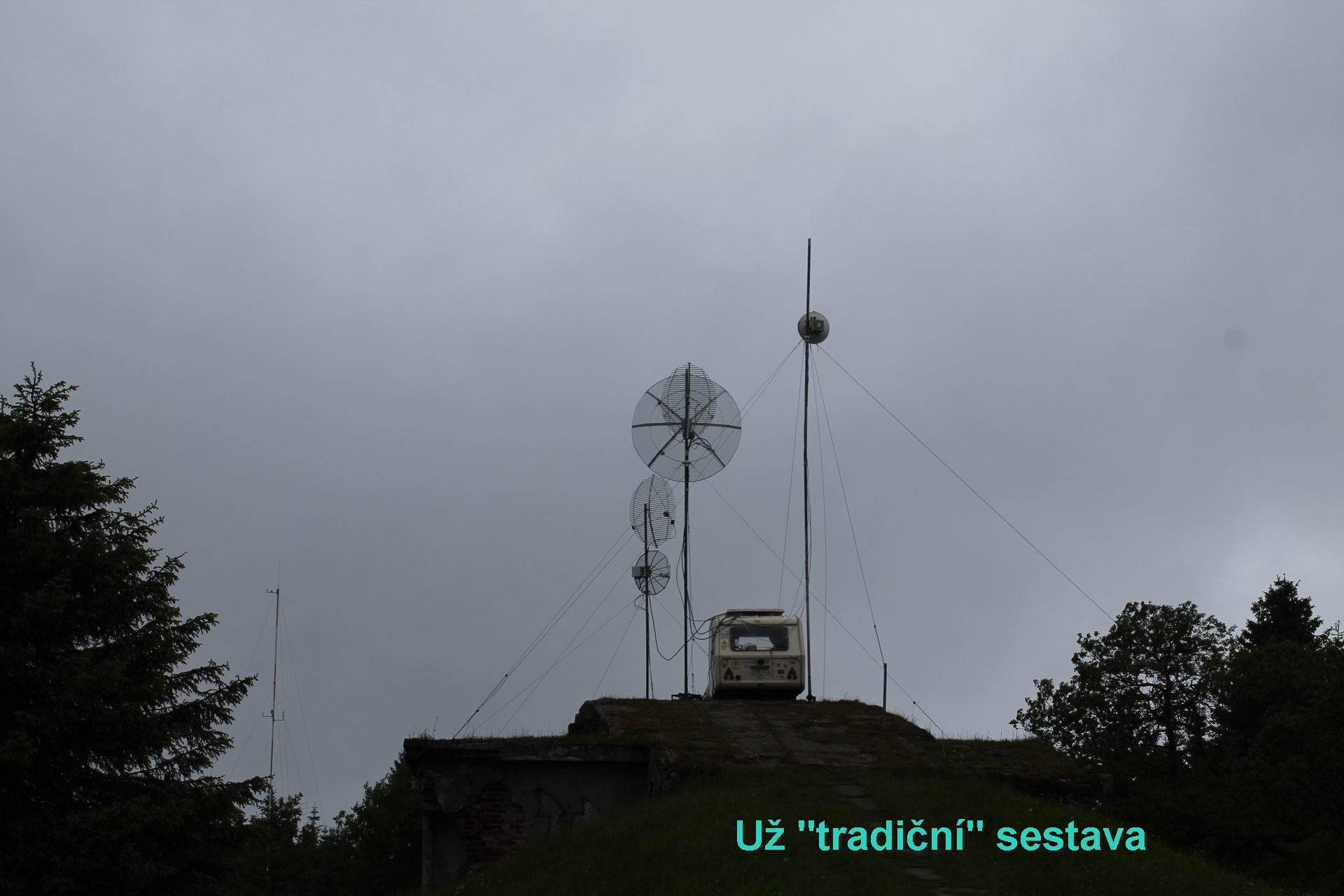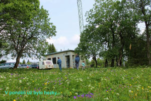 Co napsal OK1DIX: Mikrovlnný závod, normálně spíše pohodový závod, kde se toho tolik nestaví a vzhledem k poměrům panujícím dnes na (nejen) mikrovlnných amatérských VKV pásmech i operátorsky ne tak náročný. To jsme ještě nevěděli, co nám může Murphy v červnu v podobě počasí připravit. Příjezd s XYL Majkou, OK1DYX jako obvykle ve čtvrtek odpoledne. Vládne pohodička i když nás na cestě zkropilo trochu deště, ale na kopci je zatím sucho a tak stihneme připravit něco na oheň a večerní opékání. V noci přijíždějí OK1VPZ a OK1TEH. Páteční ráno nás ovšem vítá deštěm a zesilujícím větrem. Teplota je zatím jakž takž, neboť fouká od jihozápadu, ale to se také změní. Když déšť na chvíli přestane, natahujeme holínky a rozvíjíme s Majkou a Matějem síťový napájecí kabel na bunkr. Pak nás Majka opouští, neboť musí jet do Lovosic pro vnučku, kterou nemá kdo jiný hlídat.