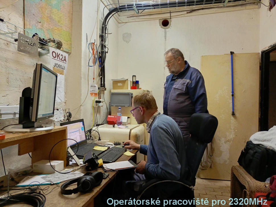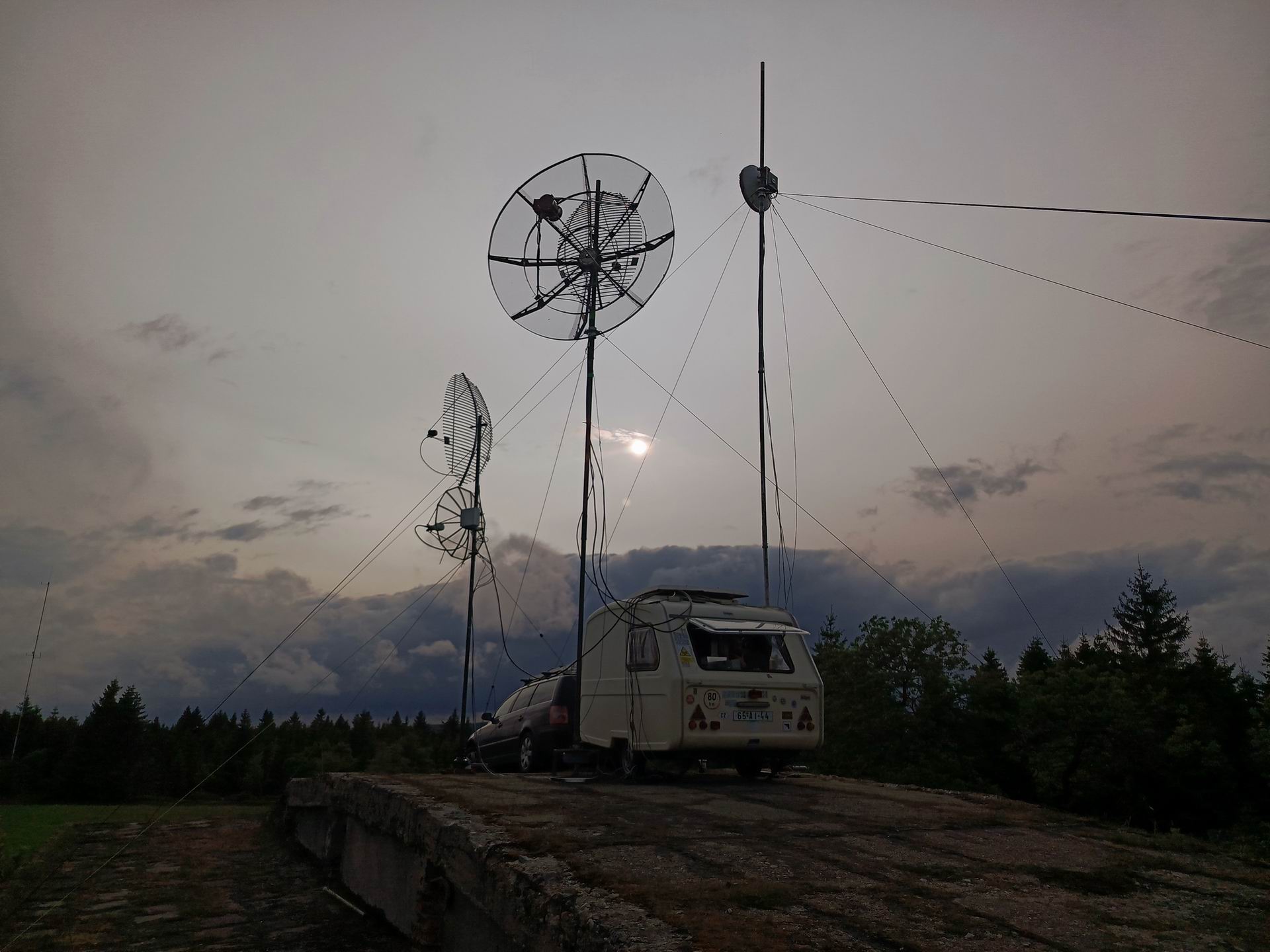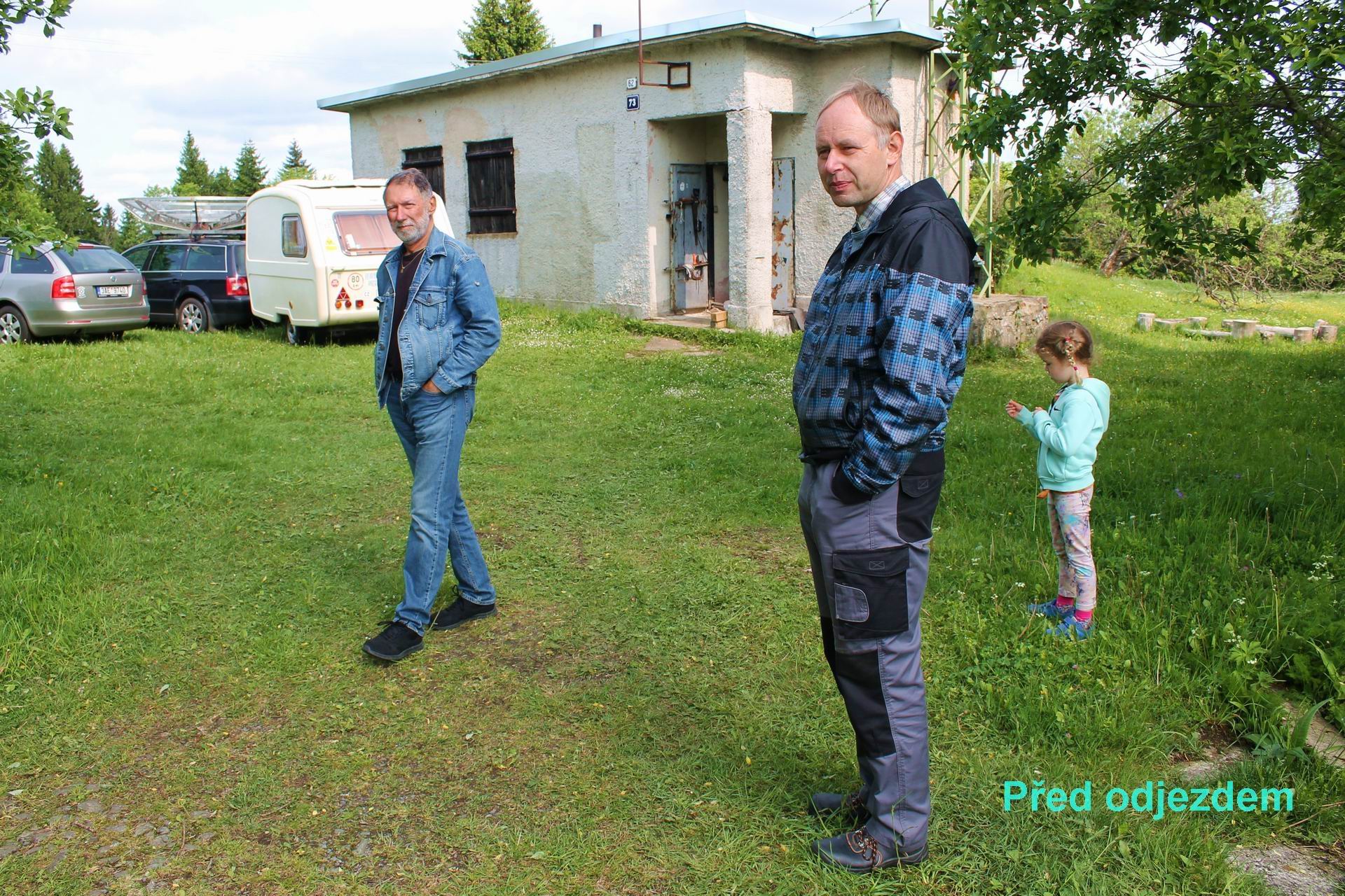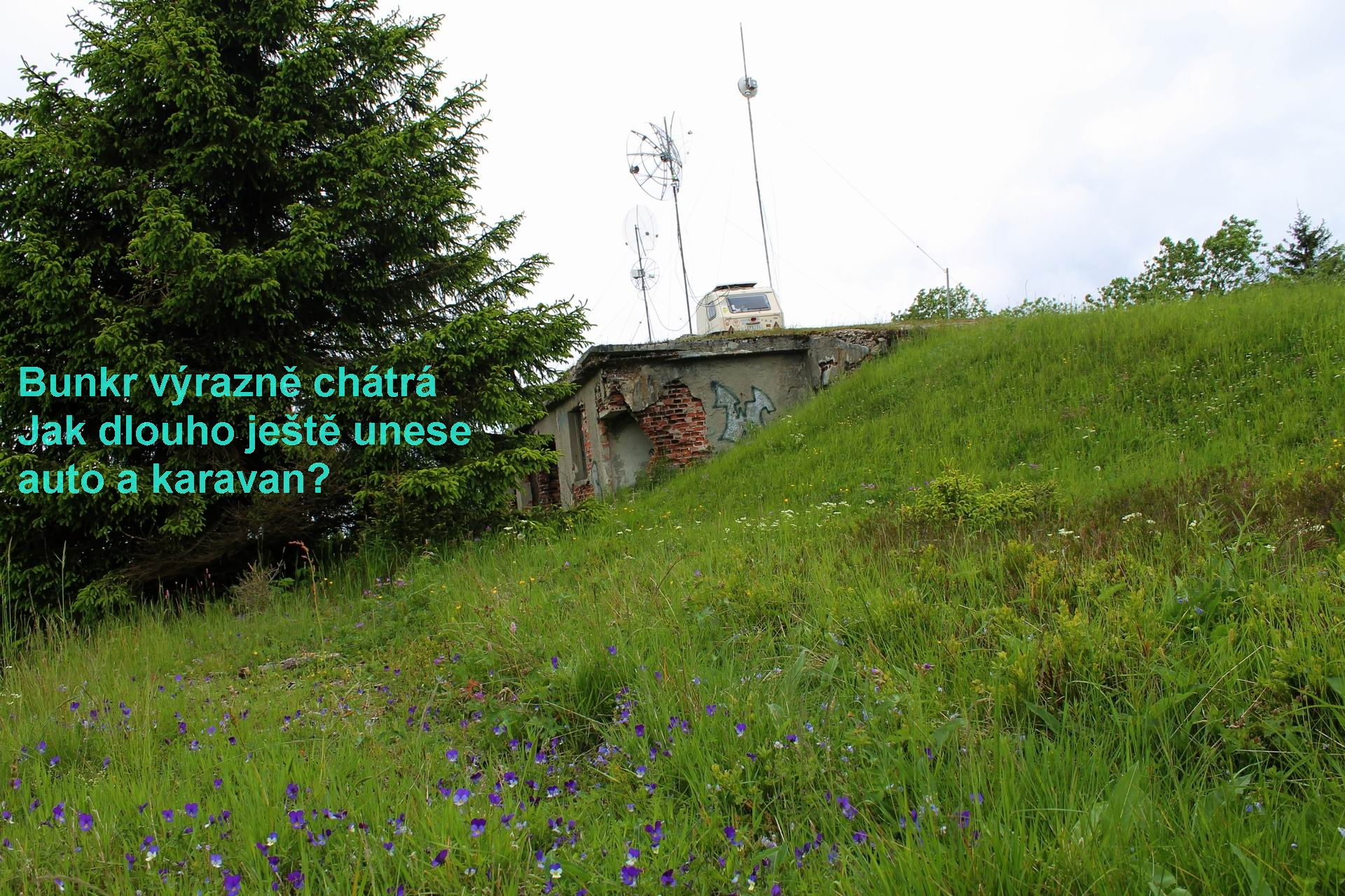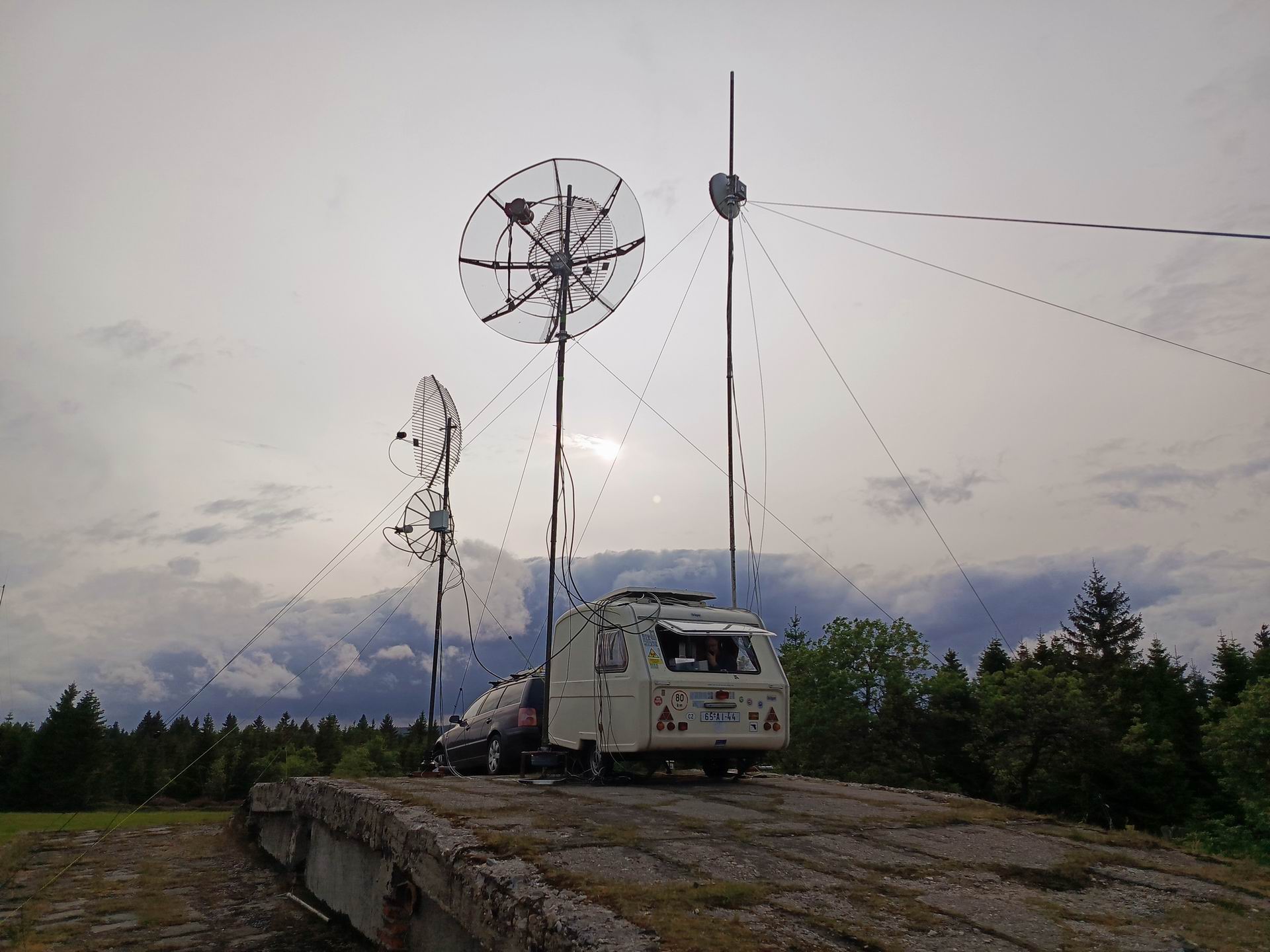 Co napsal OK1DIX: Mikrovlnný závod, normálně spíše pohodový závod, kde se toho tolik nestaví a vzhledem k poměrům panujícím dnes na (nejen) mikrovlnných amatérských VKV pásmech i operátorsky ne tak náročný. To jsme ještě nevěděli, co nám může Murphy v červnu v podobě počasí připravit. Příjezd s XYL Majkou, OK1DYX jako obvykle ve čtvrtek odpoledne. Vládne pohodička i když nás na cestě zkropilo trochu deště, ale na kopci je zatím sucho a tak stihneme připravit něco na oheň a večerní opékání. V noci přijíždějí OK1VPZ a OK1TEH. Páteční ráno nás ovšem vítá deštěm a zesilujícím větrem. Teplota je zatím jakž takž, neboť fouká od jihozápadu, ale to se také změní. Když déšť na chvíli přestane, natahujeme holínky a rozvíjíme s Majkou a Matějem síťový napájecí kabel na bunkr. Pak nás Majka opouští, neboť musí jet do Lovosic pro vnučku, kterou nemá kdo jiný hlídat.