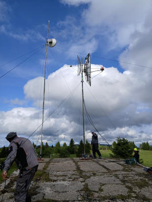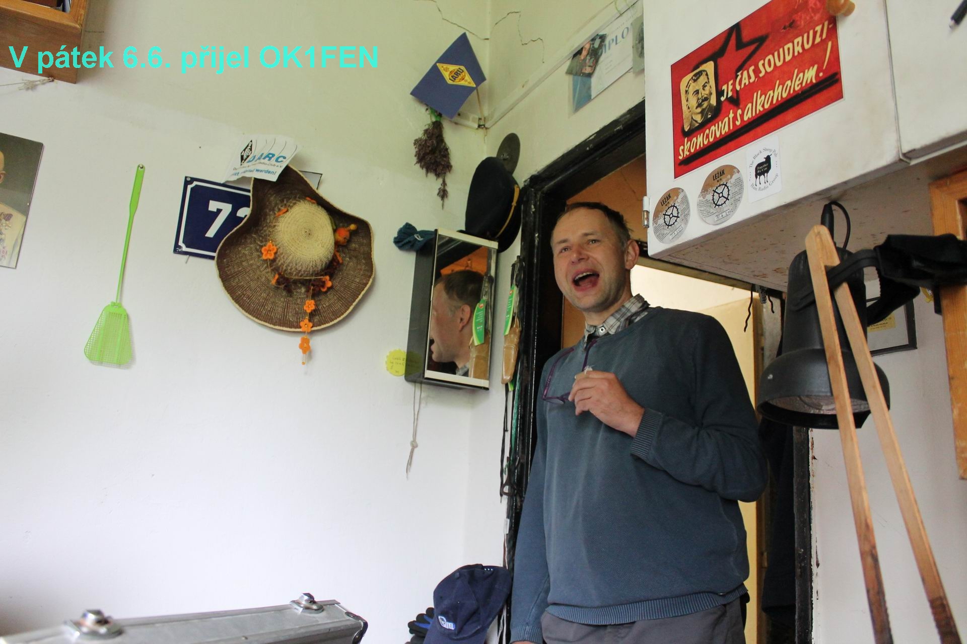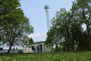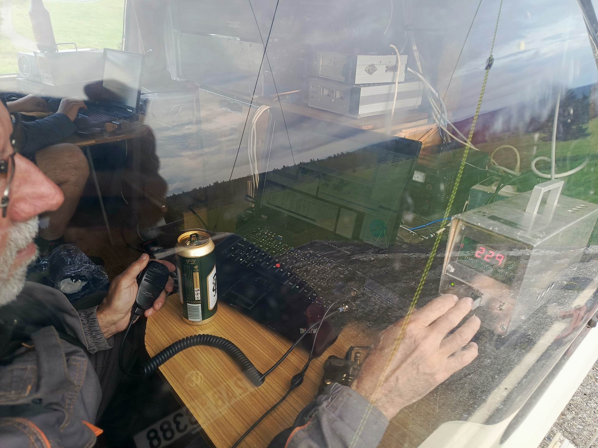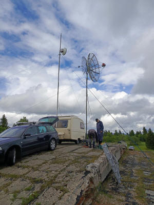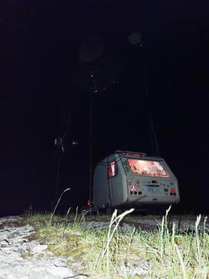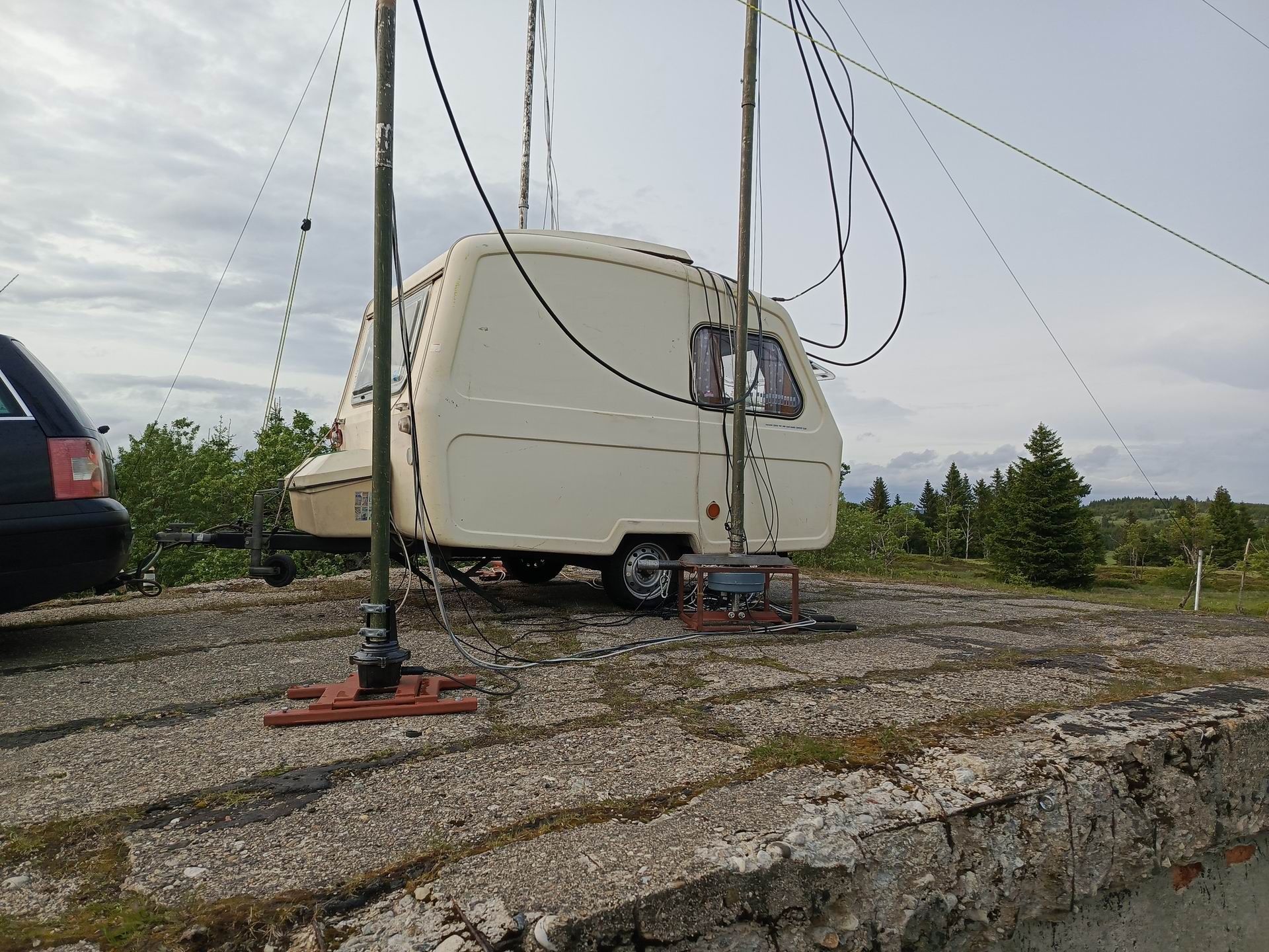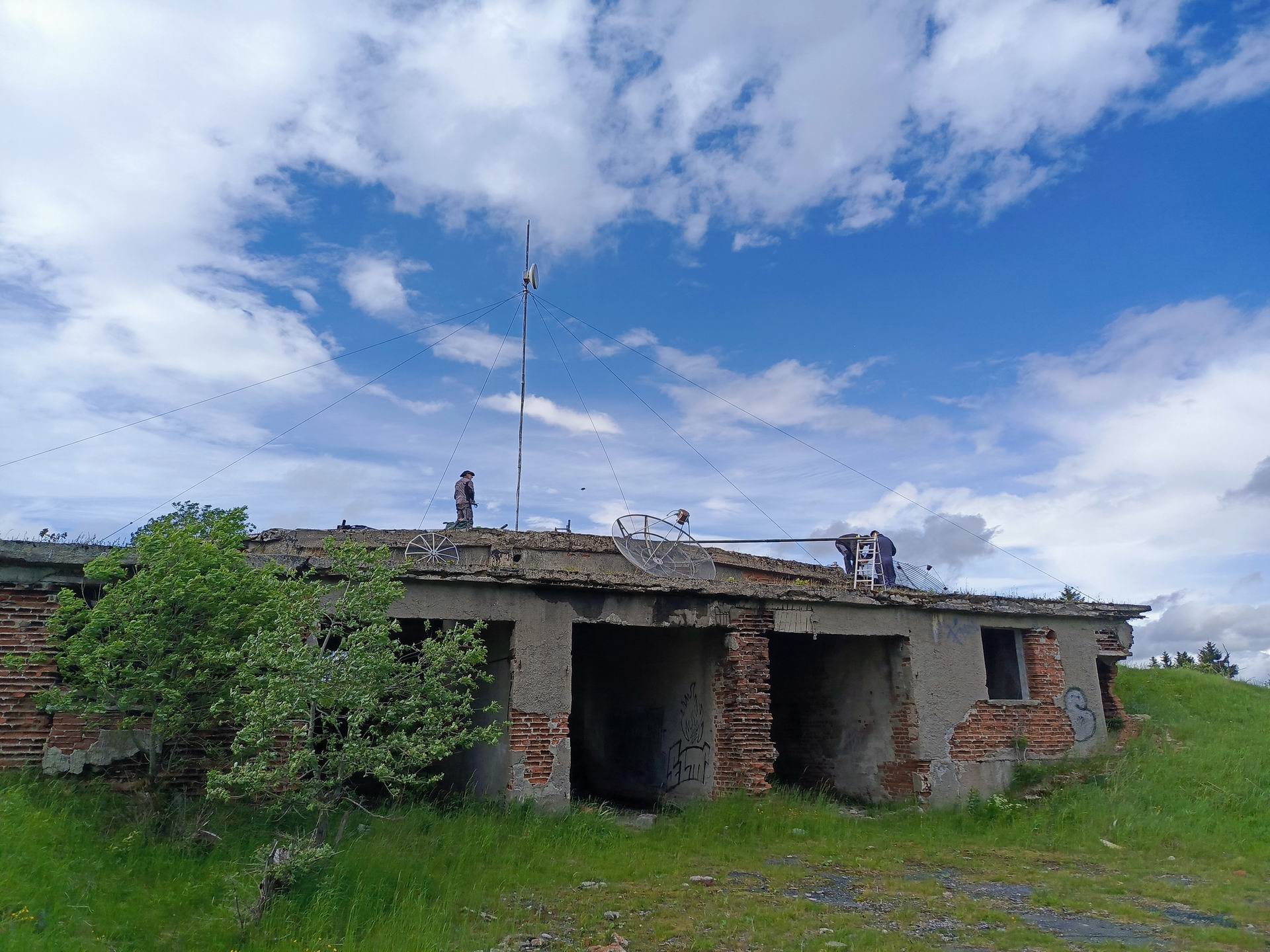 Co napsal OK1DIX: Mikrovlnný závod, normálně spíše pohodový závod, kde se toho tolik nestaví a vzhledem k poměrům panujícím dnes na (nejen) mikrovlnných amatérských VKV pásmech i operátorsky ne tak náročný. To jsme ještě nevěděli, co nám může Murphy v červnu v podobě počasí připravit. Příjezd s XYL Majkou, OK1DYX jako obvykle ve čtvrtek odpoledne. Vládne pohodička i když nás na cestě zkropilo trochu deště, ale na kopci je zatím sucho a tak stihneme připravit něco na oheň a večerní opékání. V noci přijíždějí OK1VPZ a OK1TEH. Páteční ráno nás ovšem vítá deštěm a zesilujícím větrem. Teplota je zatím jakž takž, neboť fouká od jihozápadu, ale to se také změní. Když déšť na chvíli přestane, natahujeme holínky a rozvíjíme s Majkou a Matějem síťový napájecí kabel na bunkr. Pak nás Majka opouští, neboť musí jet do Lovosic pro vnučku, kterou nemá kdo jiný hlídat.
