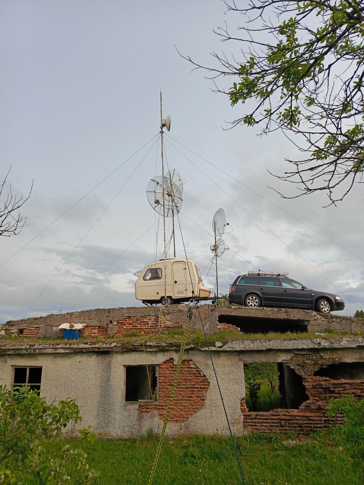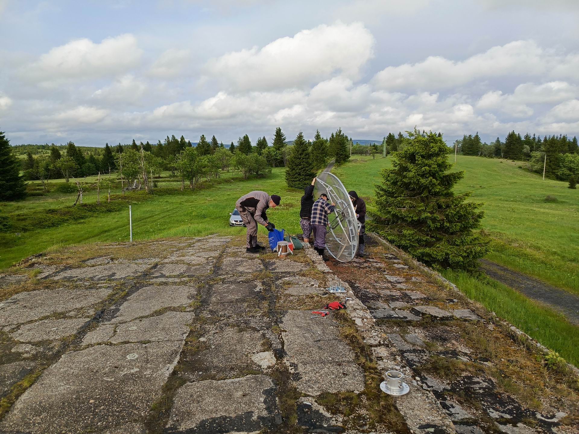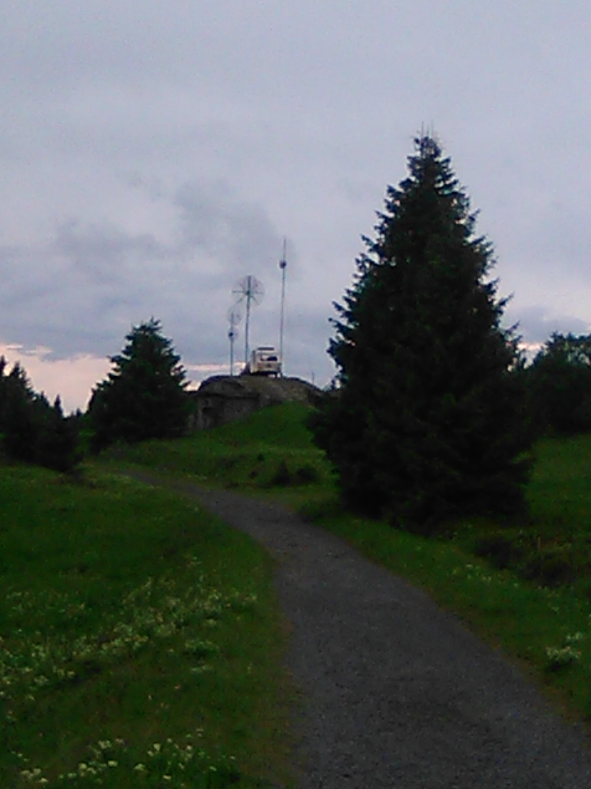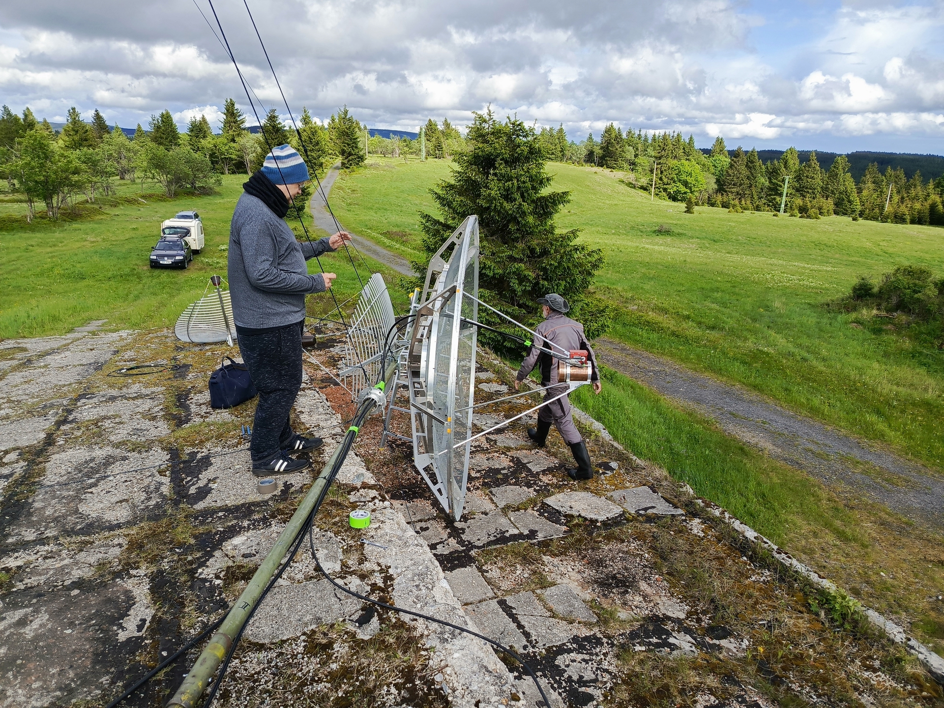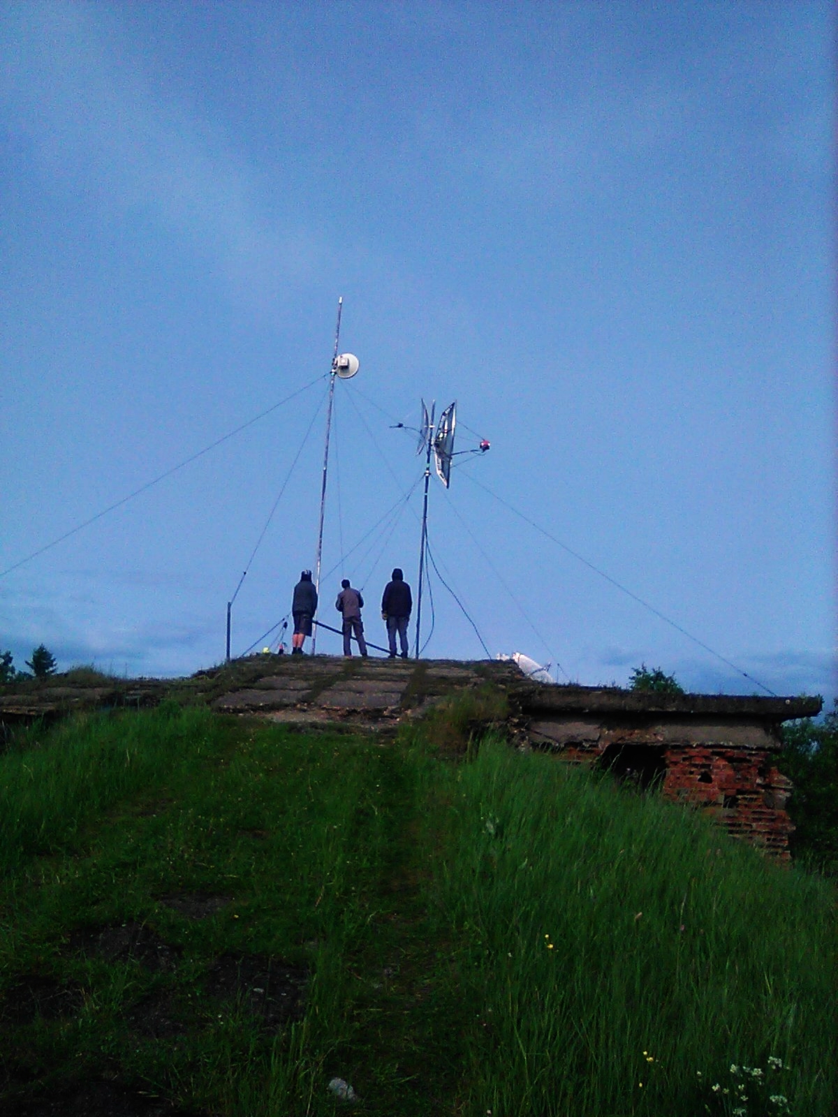Co napsal OK1DIX: Mikrovlnný závod, normálně spíše pohodový závod, kde se toho tolik nestaví a vzhledem k poměrům panujícím dnes na (nejen) mikrovlnných amatérských VKV pásmech i operátorsky ne tak náročný. To jsme ještě nevěděli, co nám může Murphy v červnu v podobě počasí připravit. Příjezd s XYL Majkou, OK1DYX jako obvykle ve čtvrtek odpoledne. Vládne pohodička i když nás na cestě zkropilo trochu deště, ale na kopci je zatím sucho a tak stihneme připravit něco na oheň a večerní opékání. V noci přijíždějí OK1VPZ a OK1TEH. Páteční ráno nás ovšem vítá deštěm a zesilujícím větrem. Teplota je zatím jakž takž, neboť fouká od jihozápadu, ale to se také změní. Když déšť na chvíli přestane, natahujeme holínky a rozvíjíme s Majkou a Matějem síťový napájecí kabel na bunkr. Pak nás Majka opouští, neboť musí jet do Lovosic pro vnučku, kterou nemá kdo jiný hlídat.