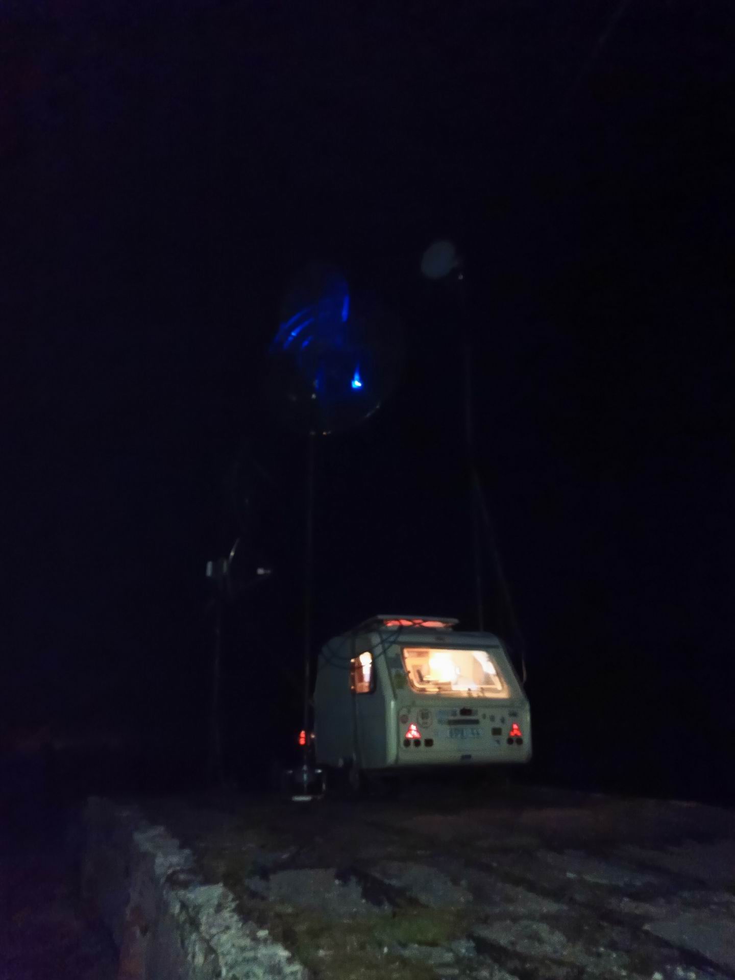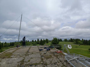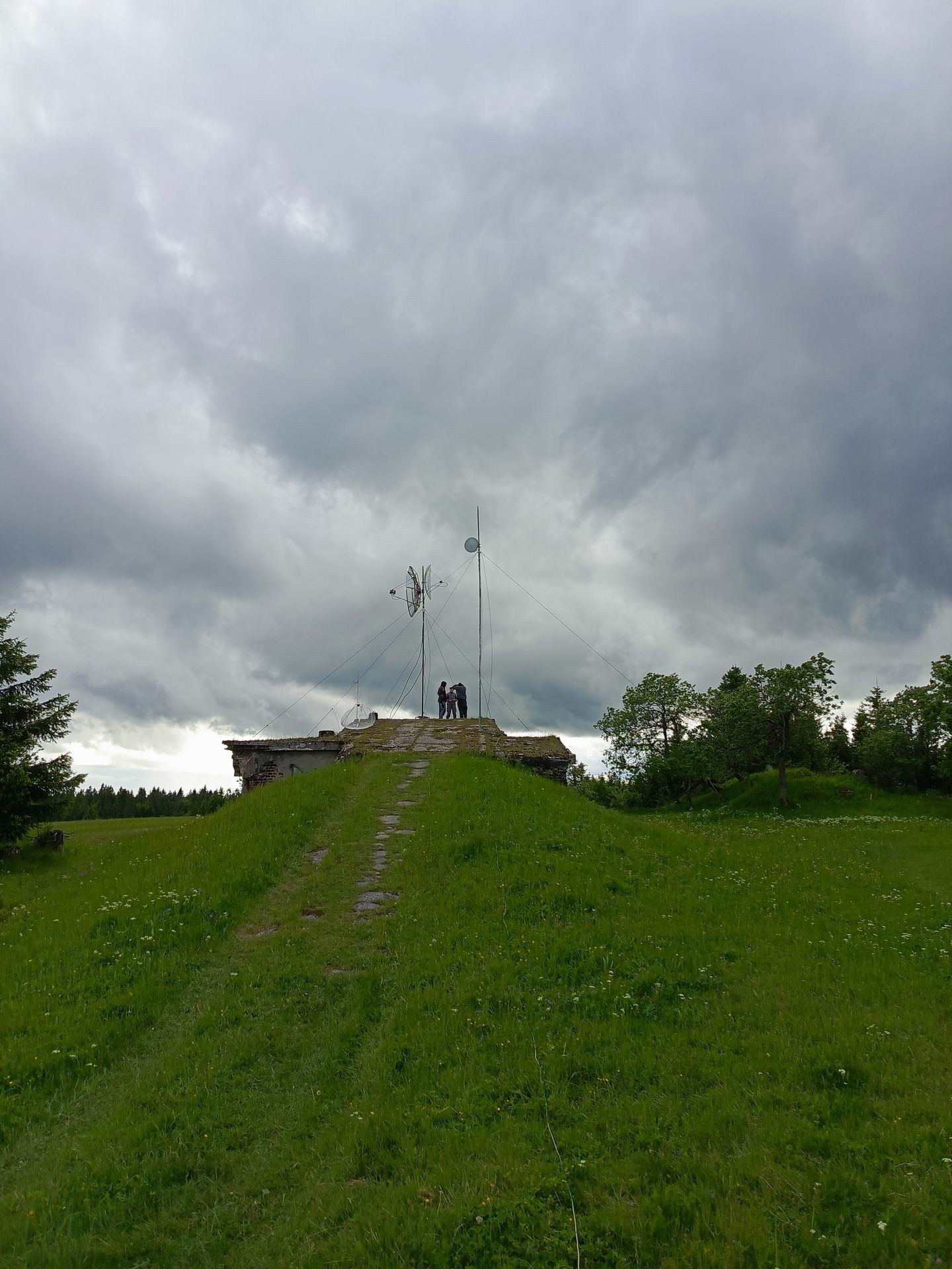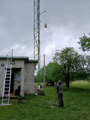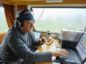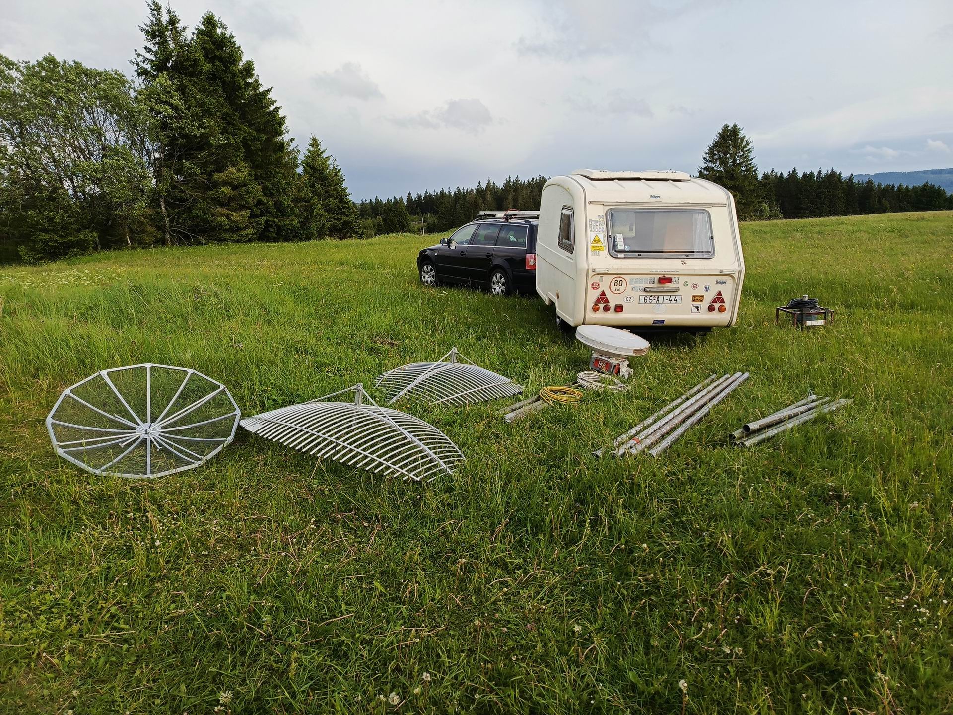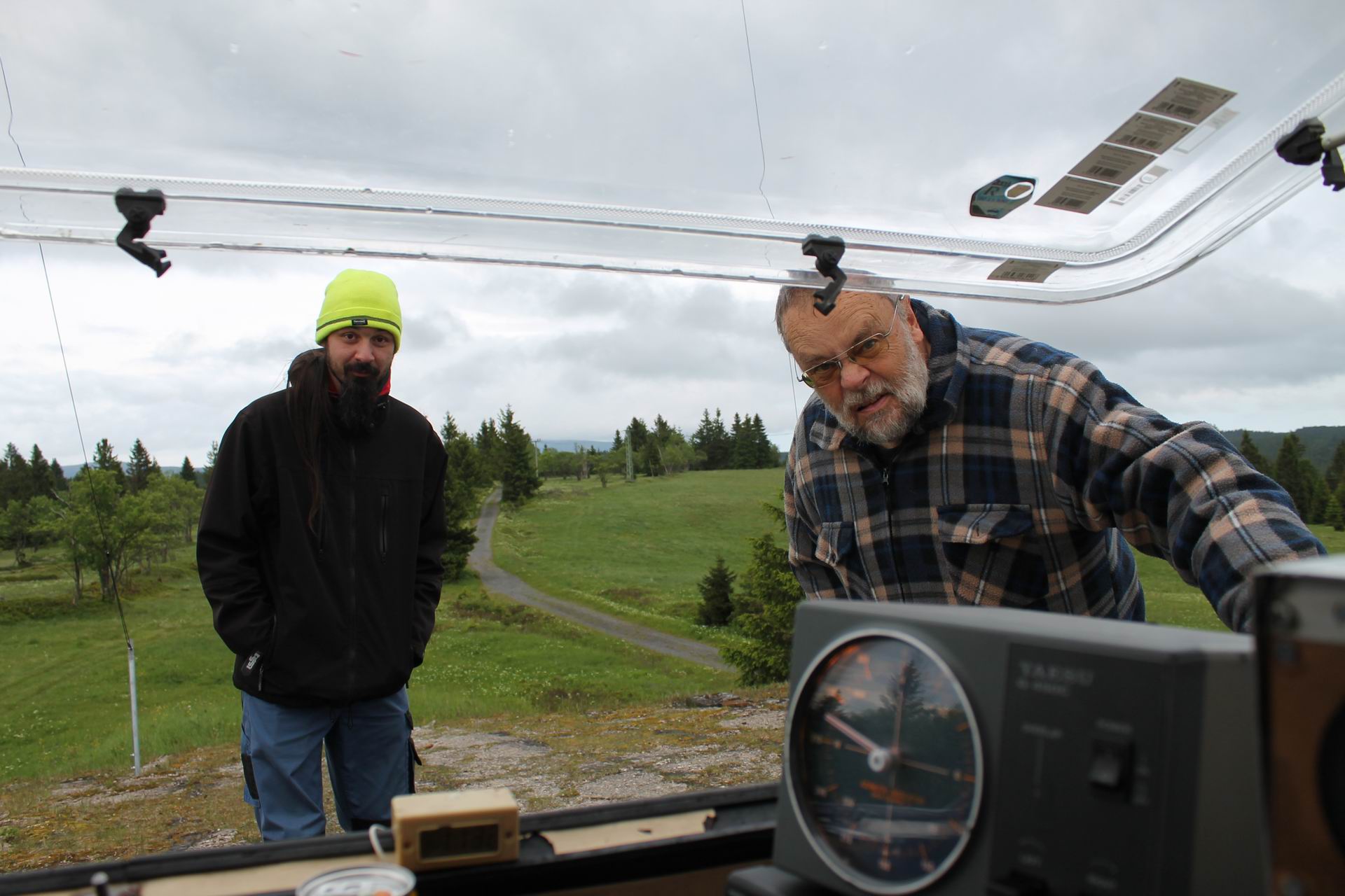 Co napsal OK1DIX: Mikrovlnný závod, normálně spíše pohodový závod, kde se toho tolik nestaví a vzhledem k poměrům panujícím dnes na (nejen) mikrovlnných amatérských VKV pásmech i operátorsky ne tak náročný. To jsme ještě nevěděli, co nám může Murphy v červnu v podobě počasí připravit. Příjezd s XYL Majkou, OK1DYX jako obvykle ve čtvrtek odpoledne. Vládne pohodička i když nás na cestě zkropilo trochu deště, ale na kopci je zatím sucho a tak stihneme připravit něco na oheň a večerní opékání. V noci přijíždějí OK1VPZ a OK1TEH. Páteční ráno nás ovšem vítá deštěm a zesilujícím větrem. Teplota je zatím jakž takž, neboť fouká od jihozápadu, ale to se také změní. Když déšť na chvíli přestane, natahujeme holínky a rozvíjíme s Majkou a Matějem síťový napájecí kabel na bunkr. Pak nás Majka opouští, neboť musí jet do Lovosic pro vnučku, kterou nemá kdo jiný hlídat.