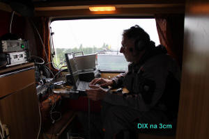 Takže opravil špatně zapájený Jak závod viděl OK1TEH: Mikrovlnný závod bývá mým nejoblíbenějším závodem v roce, protože když se nestaví 70cm, tak na všechno bývá o dost více času, bývá příjemný RS a většinou červnové počasí na rozkvetlé krušnohorské louce slibuje i příjemné posezení a relax. Bohužel tentokrát nás počasí dost vytrestalo, zpětným pohledem jsem si možná mohl vzít dovolenou již na čtvrtek, ale na druhou stanu velkou parabolu na 23cm stejně nelze postavit dřív než se na kopci potká alespoň 5 lidí.. Ať tak nebo tak, na Spáleniště jsme dorazili poměrně pozdě ze čtvrtku na pátek a venku to spíš vypadalo na začátek března, teplota kolem 10C a značně ostrý vítr.. V pátek nás při stavění co chvíli pronásledovaly občasné přeháňky a tak šla práce poměrně pomalu. Nicméně nakonec vše stálo, SWR u všech antén na 23cm vynikající, elektřina díky skvěle zvládnuté práci Karla OK1ELE (TNX) proudila a tak se většina ansámblu vydala lelkovat u ohníčku. Já jsem radši tentokrát zůstal až do cca 23h v karavanu a zapojoval - zkoušel zařízení, aby v sobotu byl případný prostor na opravu drobných chyb. Záhy jsem si opět potvrdil, že poruchy přichází v trojicích. První byl špatný napájecí kabel k ODU jednotce na 3cm, který značně jiskřil, tam byla oprava jednoduchá - výměna za jiný. Horší to bylo s ovládačem k rotátoru Yeasu G450, který zatím používám k třetímu stožáru, kde je ve výši 3m nad zemí parabola na 9cm a nad ní třetí anténa-velryba na 23cm. Ovládač sice svítil, ale rotátor se netočil. V minulosti toto byl problém špatného kontaktu v konektoru, nicméně v sobotu bylo následně zjištěno, že vakl způsobil zkrat a ovládač Yeasu má v sobě ještě druhou 4A pojistku, tentokrát na výstupu. Po provizorní opravě bude nutné do PD udělat nový konektor, aby k tomuto problému již nemohlo dojít. No a třetí problém byl závažnější, u přepínače RX směrů s SMA relátkem 1 na 3 sice docházelo k přepínání LEDek, ale nedocházelo k přepínání kontaktů v relátku. Tato závada vytrestala VPZ asi nejvíc, nakonec byl schopen identifikovat problém v nevhodném typu tranzistoru, tuším BS170, který v sobě proti schématu neměl ochranou diodu a opět kvůli špatném konektoru došlo ke krátkému spojení, vůči kterému jest stařičký mocnář zaujat. Celá tato taškařice by šla asi shrnout v to, že pokud dojde někde v telekomunikačním řetězci k problému, ve většině procent případů se jedná o problém kabelu či konektoru. V sobotu se počasí neustále horšilo, tekly provazy vody a tak začátek závodu byl poměrně pomalý. Nicméně díky vylepšenému trafu od OK1ELE chodila i tak síť PLC s baráčkem, odkud jel Robert OK1FEN na 13cm, bez problémů a tak dohazování fungovalo na 100%. Jedinou vadou na kráse byl problém s klíčovacím kabelem k FT847 na 3cm, kde kdoví proč nedochází k udržení PPT, bude to chtít asi vyměnit optron, takže pro klíčování přes VUSC bylo nutné držet při TX PTT na miku. K vlastnímu dění na pásmu - podmínky