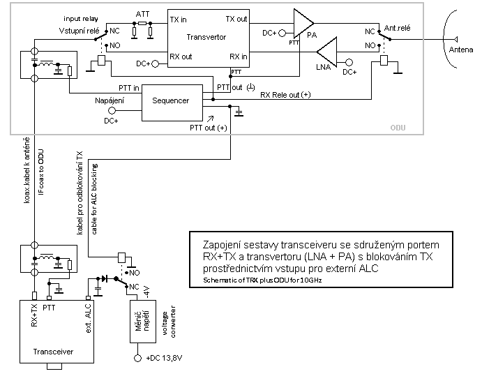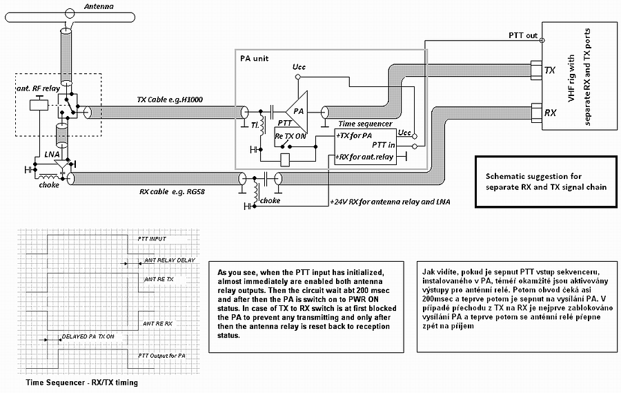 jeho zapojení. b) zhruba od sedmdesátých let se prosazuje i jiný model zapojení LNA. Je to tak zvané "dvouvýfukové" zapojení. U LNA poblíže antény je jen jedno masivní koaxiální anténní relé, které má výstup "NO" připojen ke vstupu LNA. Anténní relé je tedy aktivní jen při příjmu. Naopak TX kabel je připojen do výstupu "NC", tedy vysílač dodává signál do antény přes anténní relé, které je v klidové (vypnuté) poloze. Anténní relé je napájeno z LNA (nebo DC výhybky na přijímacím kabelu) Přijímací kabel přivádí od operátorského pracoviště DC napětí po ovládání anténního relé a zároveň i napájení LNA. To vyžaduje separátní vstup přijímače (oddělený RX vstup transceiveru) a výhybku pro napájení relé a anténního relé (nebo upravený transceiver, či PA). Výhodou tohoto řešení je tzv. "multibandové" využití anténního systému (Výhoda i na KV). Je eliminován dodatečný vodič k napájení LNA. Zapojení není tak citlivé na zničení LNA při jakémkoli přerušení ovládání systému. V případě, že operátor potřebuje odepnutí zisku LNA, stačí vypnout LNA a tak přepnout i anténní relé u konkrétního LNA do TX polohy, což se dá využít při poruše - v takovém přijímači vede dolů k vysílači relativně silný TX kabel, který slouží pro RX i TX. a zachová provozuschopnost stanice. Samozřejmě, že i v tomto zapojení je na stanici potřebný sekvencer, aby eliminoval časové kolize s odezvou anténních relé, ale záležitost není tak kritická, jako ve verzi a) Pokud tedy jste aktivní i na VKV pásmech 70cm a výše, doporučuji použít zapojení ve verzi b) Zapojení a) je "tradiční" a uplatní se zejména na KV, ovšem tam je použití LNA spíše neobvyklé. Proto je zapojení typu "dvouvýfuk" používané většinou i na 144MHz jako přechodovém pásmu mezi KV a VKV. (Hodnoceno podle toho, jak často se kde uplatňuje ionosférické šíření.)